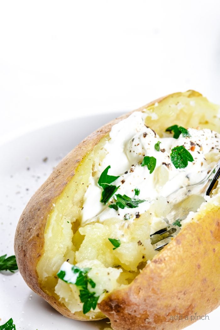 Carefully cut open your baked potato and fluff the inside of the potato using a fork. Add your favorite baked potato toppings. We love butter, sour cream, salt and pepper. A sprinkle of fresh herbs are always delicious, too!